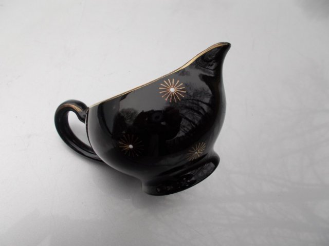 Porcelanowy Mlecznik. Design lata 50/60. Klasyczny dla przedmiotów z tego czasu kształt organiczny. Wewnątrz ecru na blyszcząco wykończone. Z zewnątrz czerń i wzór jak "Mornig Star" Meakin - złote gwiazdki z białym środkiem. Błyszczące wykończenie. Sygnatura złota,nieczytelna.