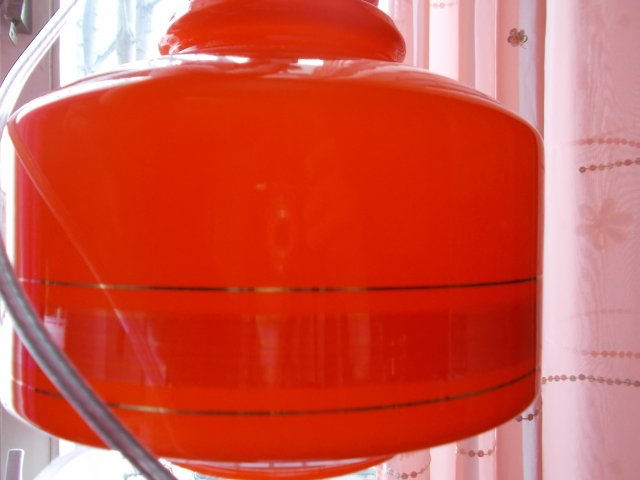Lampa - klosz szklany w pięknym,ciepłe ,przyjazne światło czyniącym pomarańczu. Design lat 60/70. Delikatny pas ciemniejszy o ton i złota; Kabel i podsufitka - gotowe do montażu - transparentne - nowe; średnica 22, otwór 11; wys klosza 21 ; kabel do regulacji; maksymalna długość całej j lampy wraz z kablem 120; Stan zachowania bdb drobny minus...jednak ma swoje lata :)