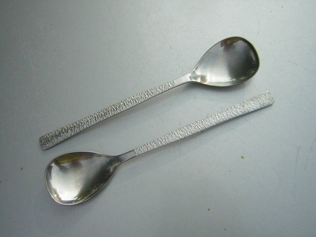 Design z lat 60 / 70. Dwie łyżki do sałatek nakładania. Ciekawy kształt i zdobienie. Sygnowane VINERS OF SHEFFIELD ENGLAND 18 / 8 STAINLESS STEEL. Rączki fakturowe, satynowe. Reszta stalowo satynowo błyszcząca.