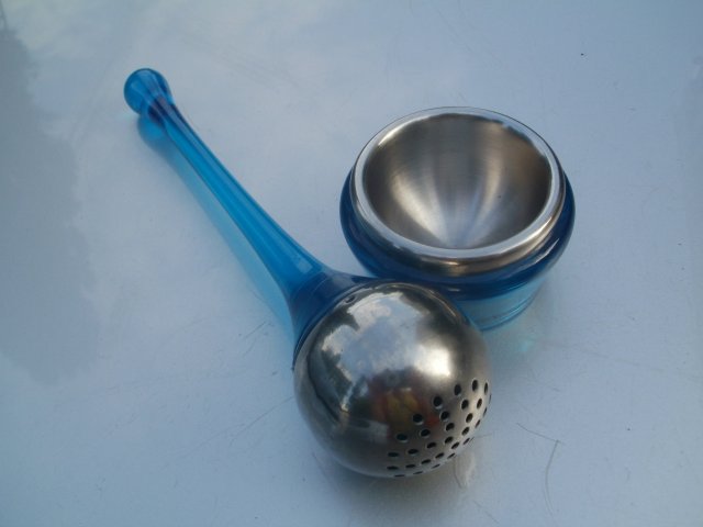 Designerska zabawka do celebracji jednoosobowego herbacianego rytuału. Szlachetna masa plasticzana w świecący niebieskim kolorze. Transparentna. . Metalowe wykończenia. Szlachetne wykonanie. Design praktyczny i estetyczny....I dowcipny.