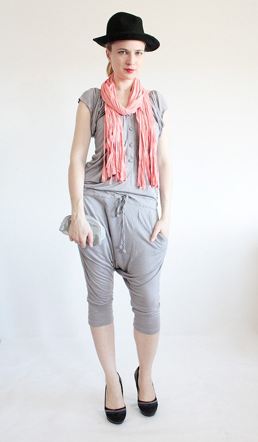 Designerski kombinezon o niezwykle ciekawym fasonie. Luźna góra fantazyjnie kontrastuje z obcisłymi nogawkami. Niski, luźny krok. Ściąganie troczkiem umożliwia regulację obwodu. Można modyfikować fason i podkreślać troczkiem talię lub linię bioder. Materiał jest elastyczny, ładnie dopasowuje się do sylwetki i efektownie się układa.