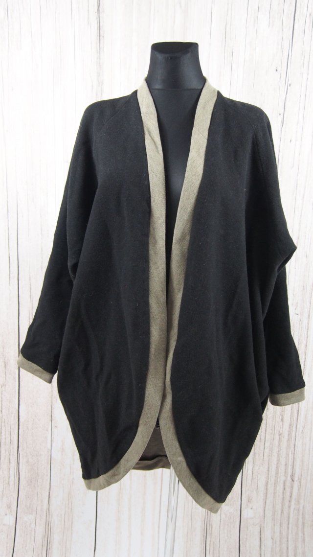 Oversizowy, o bardzo designerskim kroju pulower. Dwie obszerne kieszenie. Moim zdaniem to wełna lub wełna akrylowa.
