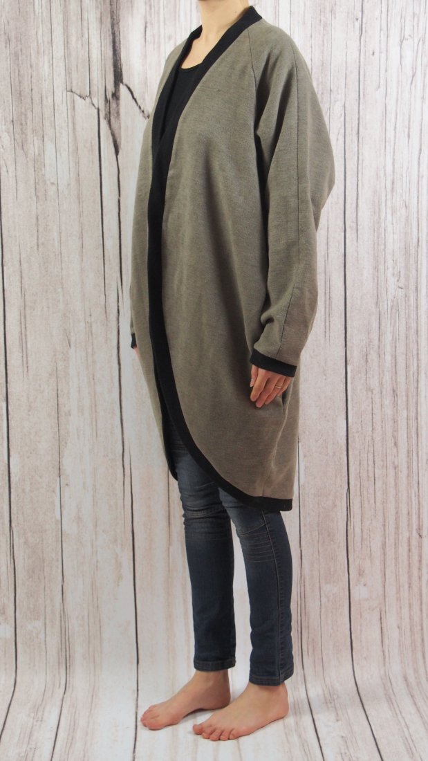 Oversizowy, o bardzo designerskim kroju pulower. Dwie obszerne kieszenie. Moim zdaniem to wełna lub wełna akrylowa.
