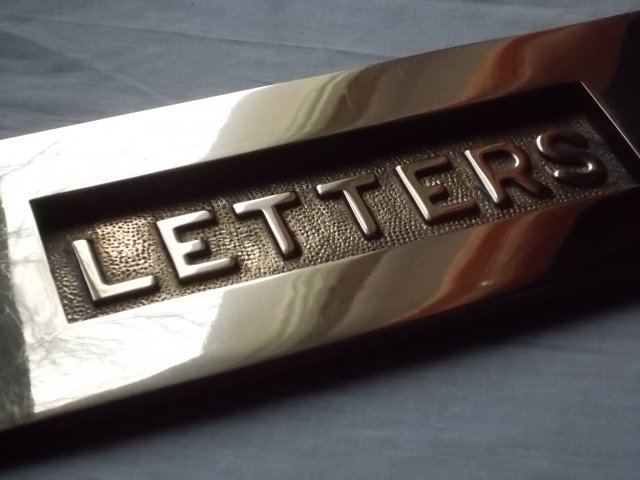Designerska, mosiężna klapka na LISTY, GAZETY do drzwi wejściowych; Obecnie raczej Designerska Ozdoba,ale oczywiście jest w pełni użytkowa...Widzę ją na starych drzwiach w kamienicy,bądz stylizowanych w domu....Rzadko zdarzają się już takie przedmioty w tak doskonałym stanie zachowania,oraz jeszcze rzadziej z napisem w języku angielskim /najczęściej jest niemiecki/. Fantastyczna to rzecz :)