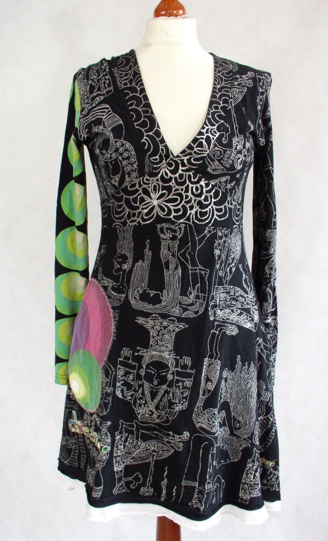 Sukienka firmy Desigual.Metka obcięta.W wewnątrz nadruk-Desigual I want dreams In winter,summer dreams.I dream you.I dream all together Dream.Odcięta w pasie z wstawionym pasem.Z prawego boku naszyta aplikacja + napis dream..Dół podszyty białym paskiem.Rękaw długi,wąski.Na plecach wyhaftowany napis Desigual.Stan ogólnie dobry+.Długość 89 cm.pod pachami 100 cm.pas 82 cm.biodra 94 cm.Materiał mięsisty,bawełna?