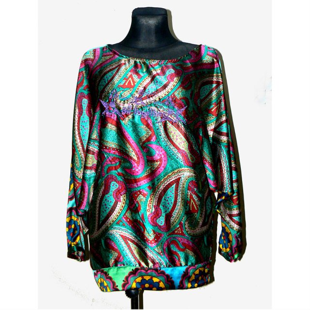 Bluzka z satyny renomowanej i cenionej marki Desigual. Bluzka o kroju motyla w przepięknych barwach, uszyta z materiałów o dwóch uzupełniających się wzorach (przód i tył). Rękawy i jeden z boków wykończone guzikami. Material lejący, świetnej jakości.