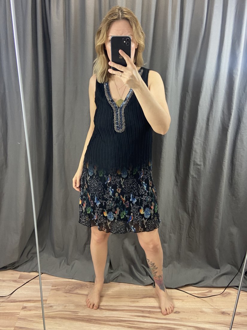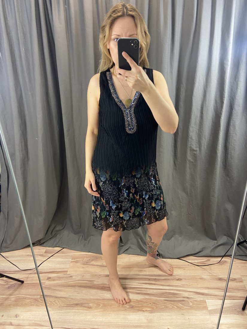 Desigual. Śliczna sukienka z koralikowym dekoltem. Wierzch gnieciony. Podszewka z wiskozy, Wierzch z lekkigeo, transparentego poliestru.