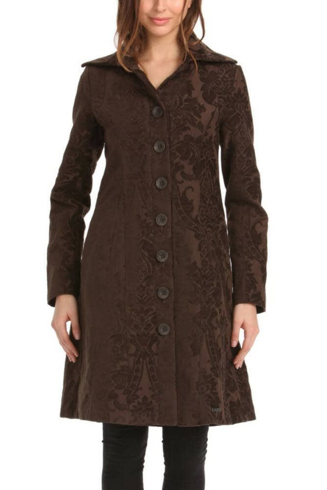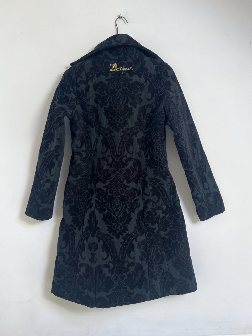 Czarny płaszcz z kwiatowym wzorem, zapinany na guziki. Stan bdb.
