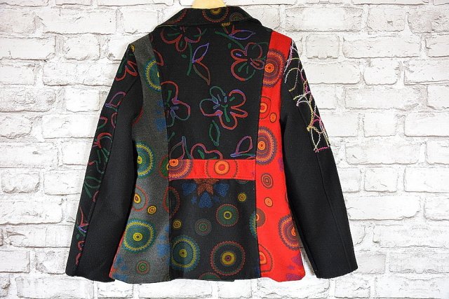 Cudny wełniany płaszczyk w stylu marki Desigual, ładnie skrojony o poszerzanym kroju , zapinany na guziczki, po bokach kieszonki, pod szyją kołnierzyk- można nosić tradycyjnie z rozłożnym kołnierzem, lub zapiąć i mamy wtedy płaszcz ze stójką. Unikatowy, fajny kolorowy w różne printy - sezon wiosna-jesień.