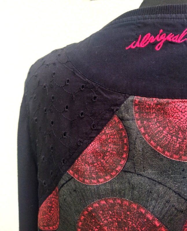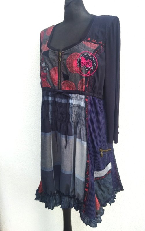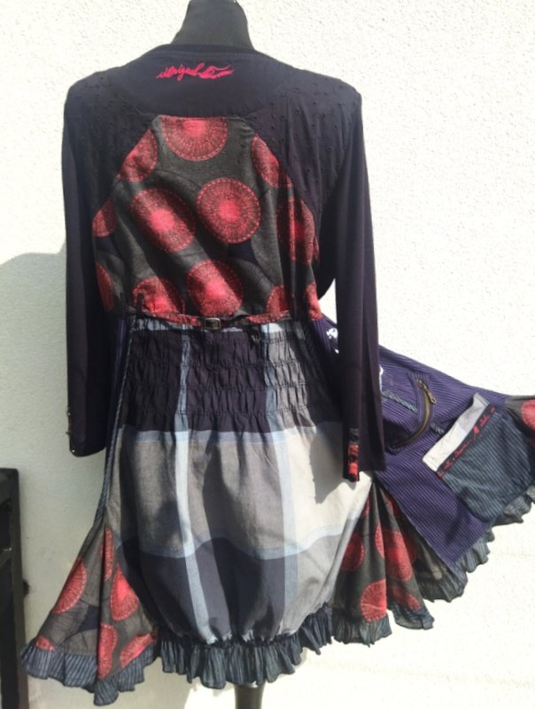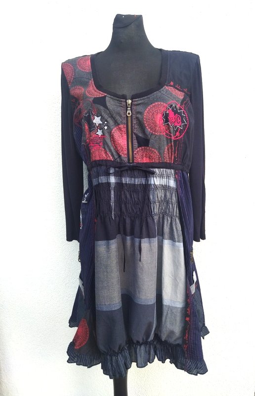 Świetna sukienka marki desigual z łączonych bawełnianych tkanin z charakterystycznymi dla tej marki zdobieniami i detalami.