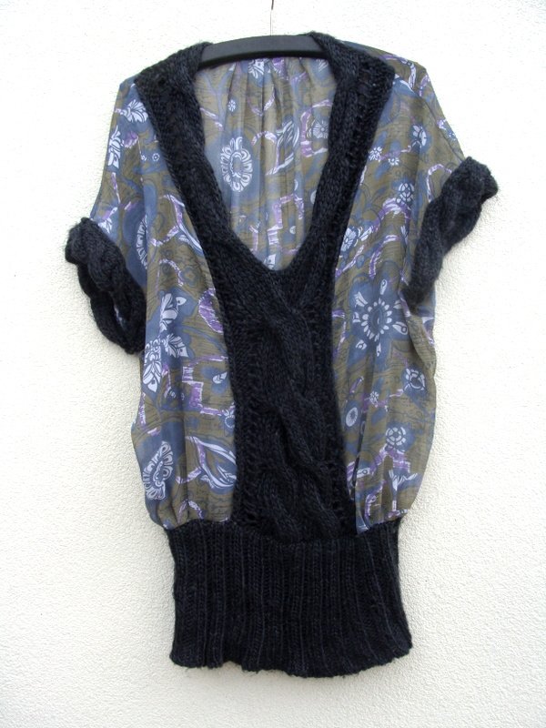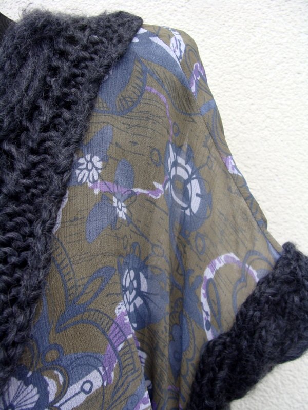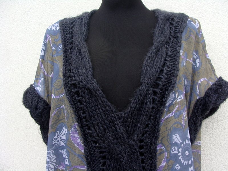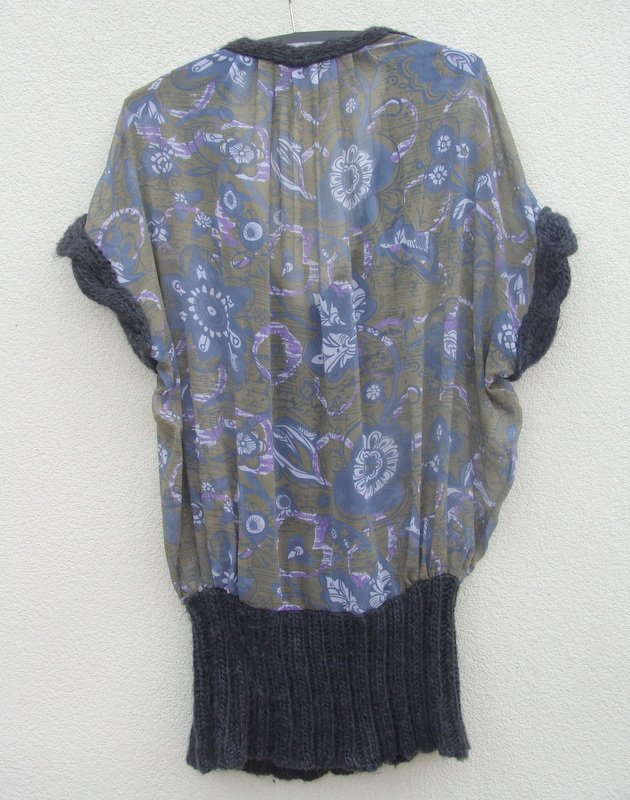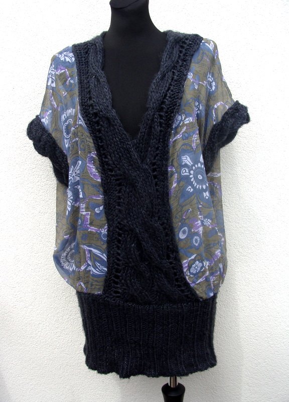 Tunika lub dłuższa luźna bluzka w kształcie litery V - fason nietoperza z łączonych materiałów: cienkiej żorżety wiskozowej z wzorami kwiatowymi w kolorystyce oliwki, fioletu, bieli i stalowej szarości oraz mięsistej miękkiej ciemnoszarej włóczki w elementach wykończeniowych ( warkoczowa plisa z przodu i wokół rękawów oraz ściągacz u dołu).