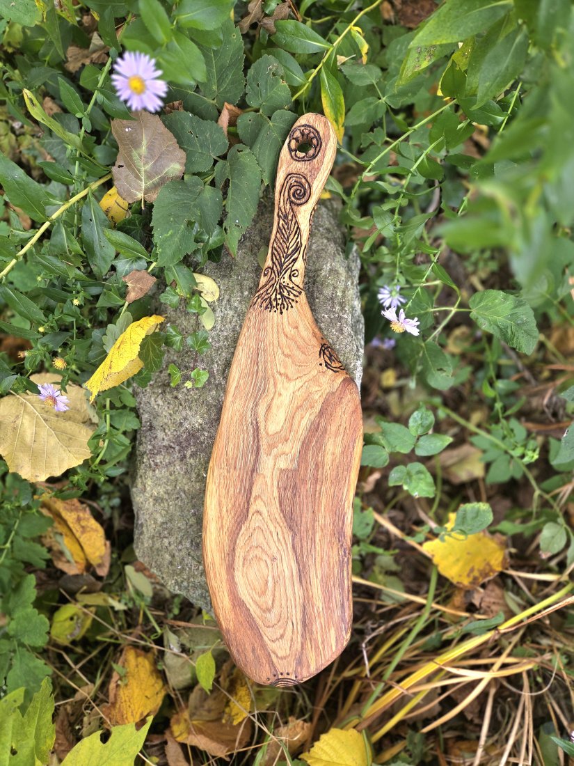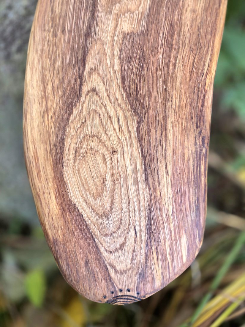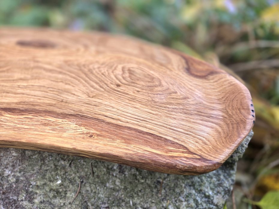 Deska do krojenia wykonana z drewna dębowego. Po drugiej stronie jest półmiskiem do podawania wszelkiego rodzaju potraw. Ma zatem podwójne zastosowanie, wygodna i idealna do kuchni, wytrzymała, gotowa do użycia. Całość została wykonana ręcznie, a na rączce deski wyrzeźbiłem motyw kwiatowy inspirowany celtycką ornamentyką. Rzeźbienia podkreśliłem przy pomocy pirografu.
