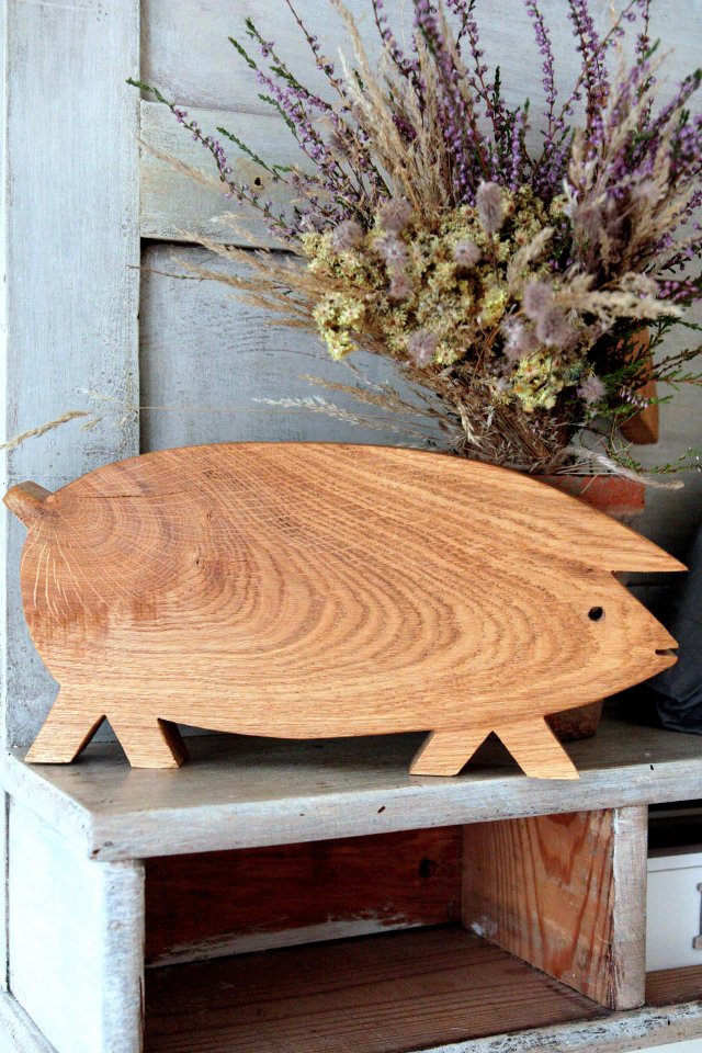 Świetna, porządna, dębowa deska do krojenia w kształcie świnki. Świetny dodatek do rustykalnej kuchni:) Zabezpieczony olejem nadającym się do kontaktu z żywnością:)