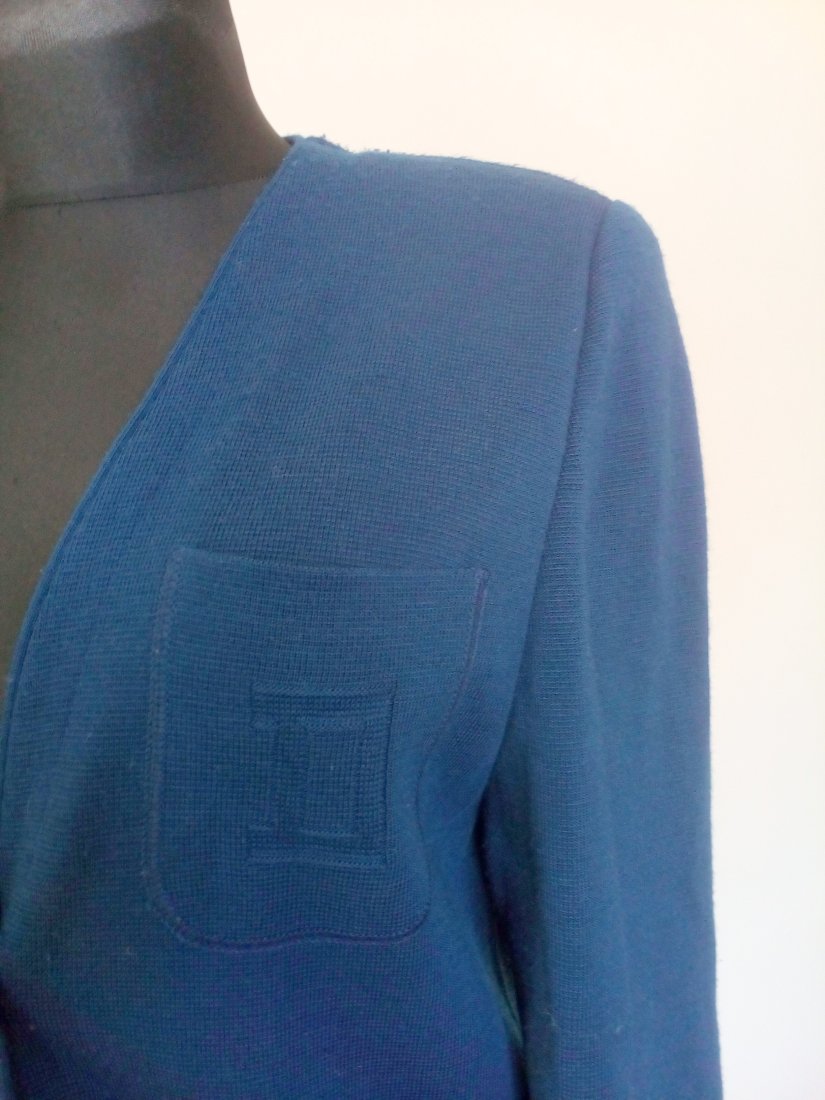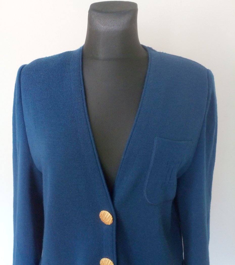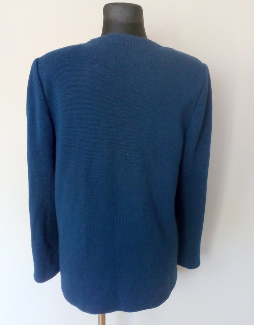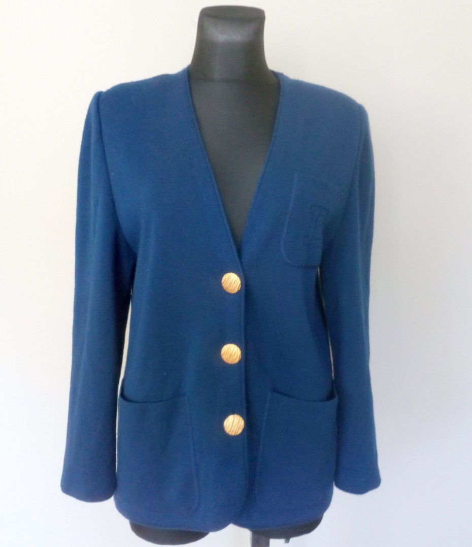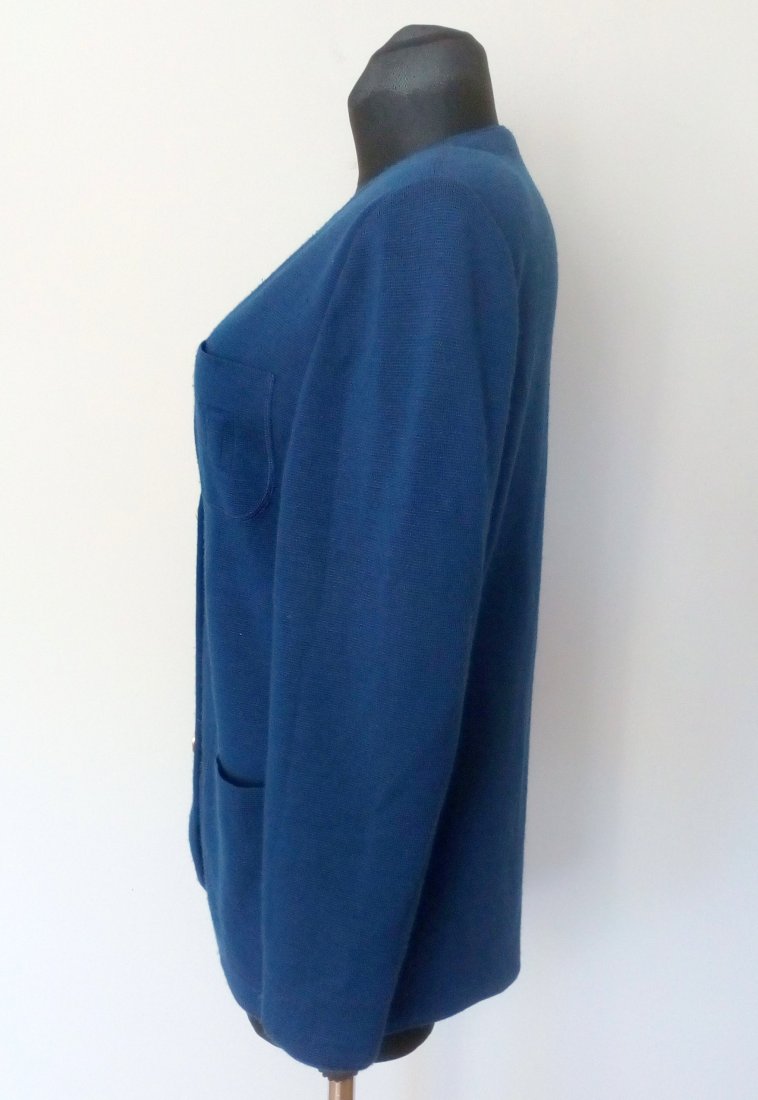 ciemnoniebieski kardigan z przewagą wełny w składzie, zapinany na trzy guziki w złotym kolorze, na lewej piersi naszyta kieszeń, u dołu przodu dwie naszywane kieszenie, na ramionach poduszki, całość bez podszewki