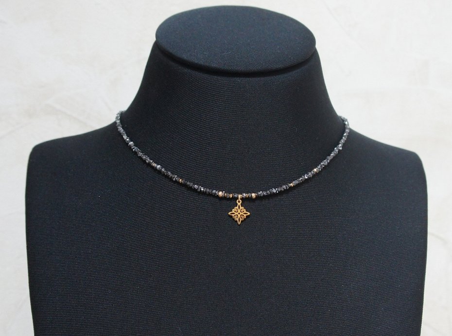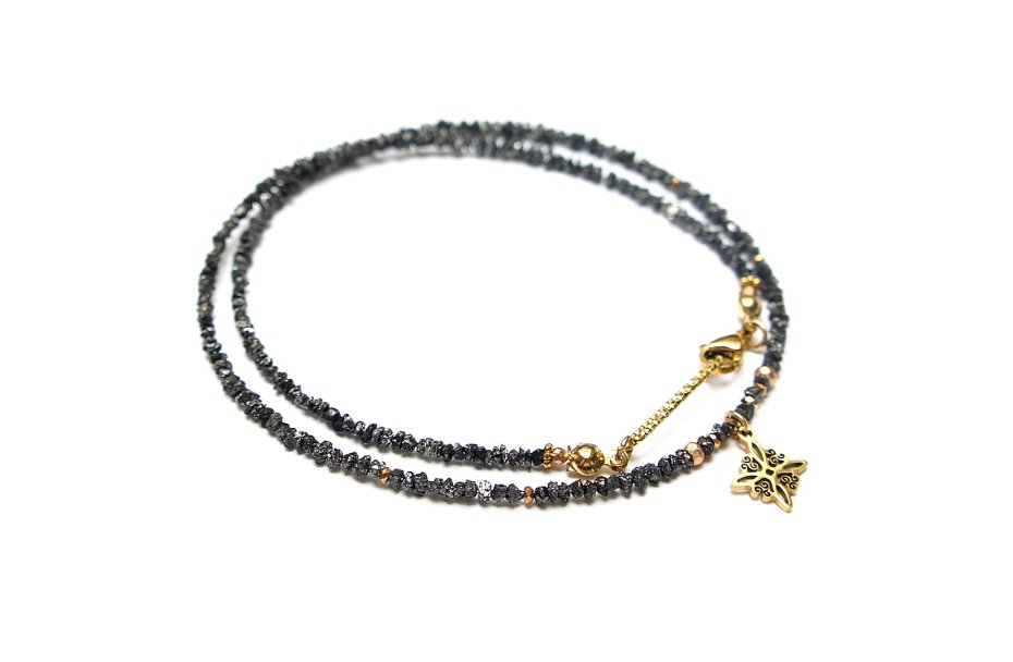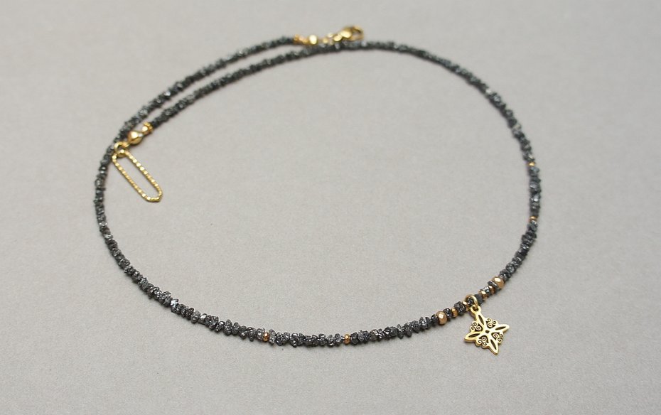 Krótki naszyjnik wykonany w całości z pozłacanej stali szlachetnej oraz naturalnych, szlachetnych kamieni - bryłki surowych diamentów w kolorze czarnym [ok. od 1 do 4mm], hematyt fasetowany o matowej powłoce [2 i 4mm], przekładek z hematytu [1mm]. Naszyjnik o długości ok. 43cm. Do kompletu można dokupić bransoletkę - widoczną na zdjęciach.