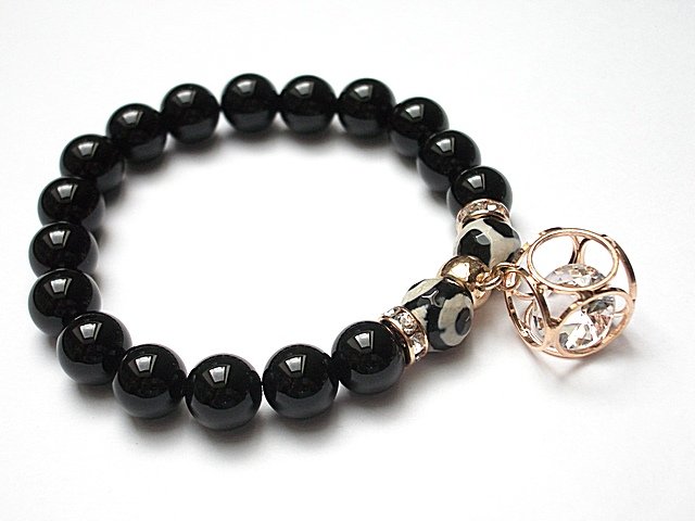 Bransoletka wykonana z kamieni naturalnych - onyks [10mm], agaty [10mm], przywieszki z mosiądzu w kolorze złotym [w środku kostki znajduje się cyrkonia w kolorze crystal, która kształtem przypomina diament] oraz elementów metalowych w kolorze złota. Bransoletka na gumce silikonowej. Pasuje na nadgarstek 16-17cm. Biżuteria ozdobnie zapakowana.
