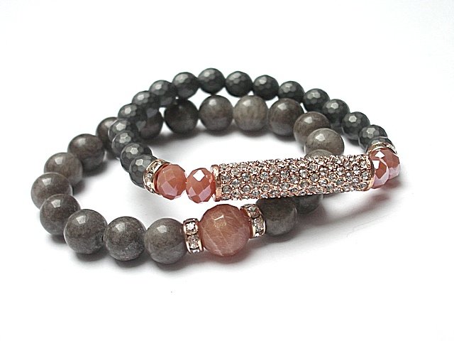 PROJEKTY AUTORSKIE. WŁASNOŚĆ KI-KA. KOPIOWANIE ZABRONIONE. Komplet dwóch bransoletek wykonanych z naturalnych kamieni - hematyt fasetowany [8mm], marmur [10mm], kamień słoneczny [12mm], kryształków fasetowanych [6 x 8mm], przekładek wysadzanych kryształkami, tuby z mosiądzu wysadzanej cyrkoniami Bransoletki na gumce silikonowej. Pasują na nadgarstek 16-17cm. Biżuteria ozdobnie zapakowana.