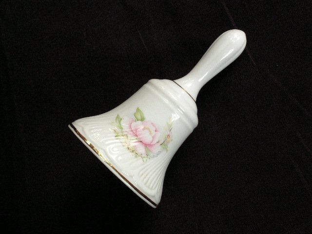 Duuży porcelanowy dzwonek, sygnowany Diana, dawny wyrób z Rumunii. Błyszczące szkliwienie, delikatny wzór kwiatowy, ryflowania i złocenia. Wygodny, lekki, przyjemnie dźwięczący :) 8 x 13,5 cm. Stan zachowania bardzo dobry minus widoczny klej w mocowaniu serca dzwonka, w samej głębi, pod rączką.