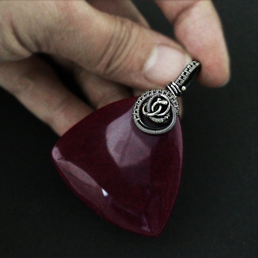 Wisiorek z trójkątnego agatu o łagodnie zaokrąglonych brzegach emanuje głębią koloru i surową elegancją. Kamień, o bokach długości 4,5 cm, przyciąga wzrok nasyconym odcieniem ciemnej fuksji – barwy intensywnej i szlachetnej, przypominającej świeżo przekrojony miąższ buraka lub świeżą ćwikłę. Gładka, matowo-lśniąca powierzchnia agatu wydaje się chłonąć światło, a gdy spojrzeć pod odpowiednim kątem, pojawia się niemal niedostrzegalna poświata fioletu, jakby zaklęta w jego wnętrzu. Kamień nie jest przejrzysty – jego masa i barwa dają poczucie siły oraz spokoju.