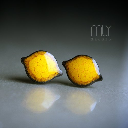 Ceramiczne kolczyki w formie sztyftów, ręcznie wykonane z delikatnej gliny kamionkowej, jednostronnie szkliwione mieszanką żółtych szkliw z efektem plamek, na antyalergicznych sztyftach w kolorze srebrnym. Długość ok. 14mm.. Polecam . Termin realizacji zamówienia to 1-2 dni