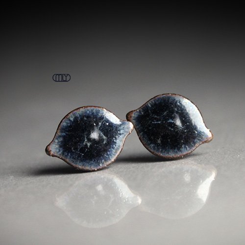 Ceramiczne kolczyki w formie sztyftów, ręcznie wykonane z delikatnej gliny kamionkowej, jednostronnie szkliwione mieszanką szarych szkliw z efektem plamek, na antyalergicznych sztyftach w kolorze srebrnym. Długość ok. 14mm.. Polecam