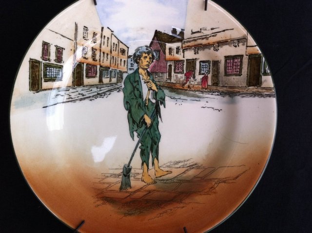 Kolekcjonerski talerz porcelanowy, sygnowany najwyższą jakością Royal Doulton - ceniona, artystyczna seria z postaciami z powieści Dickensa - tutaj Poor Jo, piękną delikatną kreską przedstawiony :) Wysoka jakość malatury; błyszczące jedwabiste szkliwienie. Z tyłu profesjonalny uchwyt do zawieszenia, którego prawy dolny element zakrywa niegroźny odprysk od spodu rantu. 19 x 3 cm. Stan zachowania dobry. Szlachetny. Wartość kolekcjonerska.