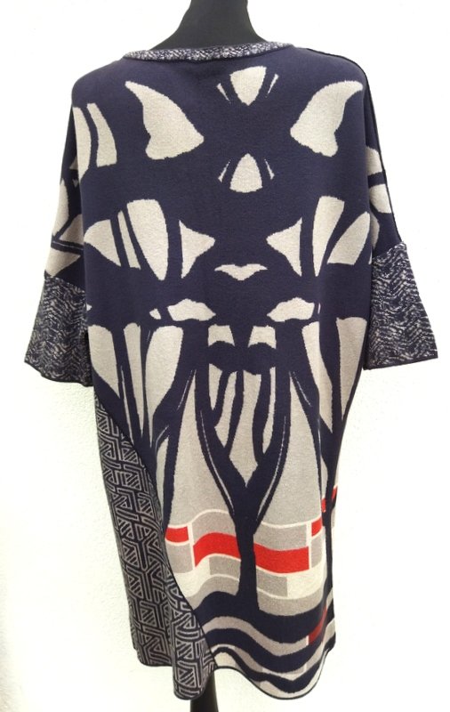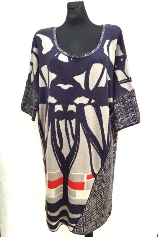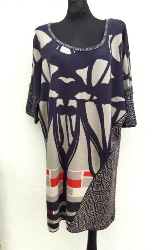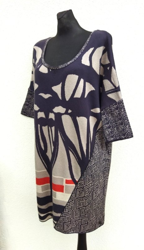 Ciekawa wzorzysta sukienka z tegiej dzianiny w kolorystyce, granatu, beżu, szarości i ceglastej czerwieni. Fason w kształcie litery V -szersza u góry, owalny dekolt niżej doszywane rękawki