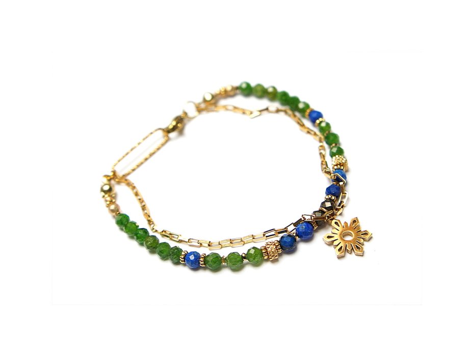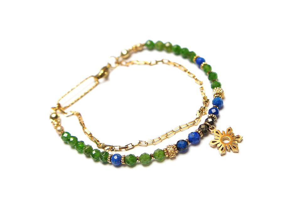 Delikatna bransoletka wykonana w całości ze stali szlachetnej pozłacanej oraz naturalnych, szlachetnych kamieni - fasetowanych kuleczek diopsydu [śr. 4mm], fasetowanych kuleczek pirytu [3,5mm], fasetowanych kuleczek lapis lazuli [4mm], przekładek z hematytu [1mm]. Całkowita długość bransoletki: ok. 18cm. Na życzenie możemy pomniejszyć lub powiększyć bransoletkę - wcześniej prosimy o kontakt.