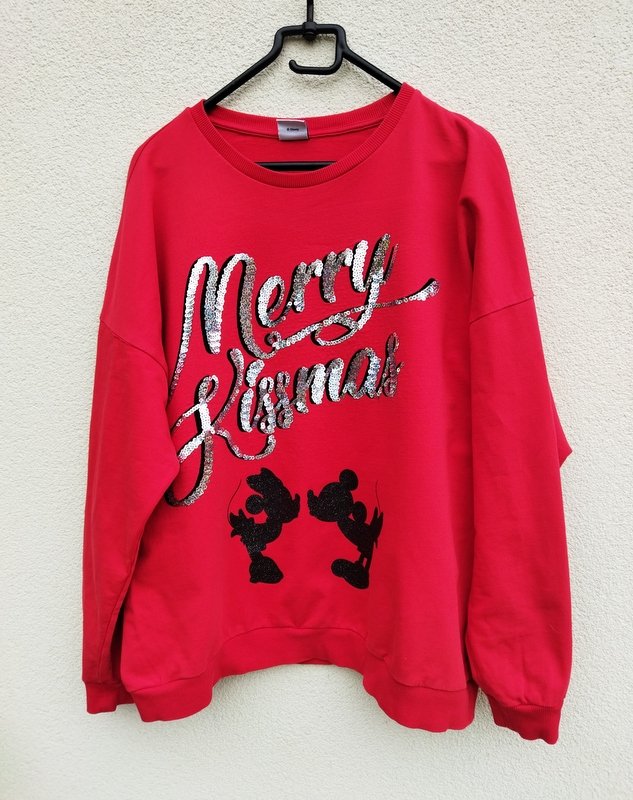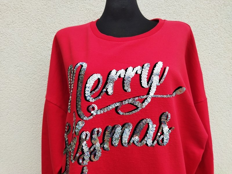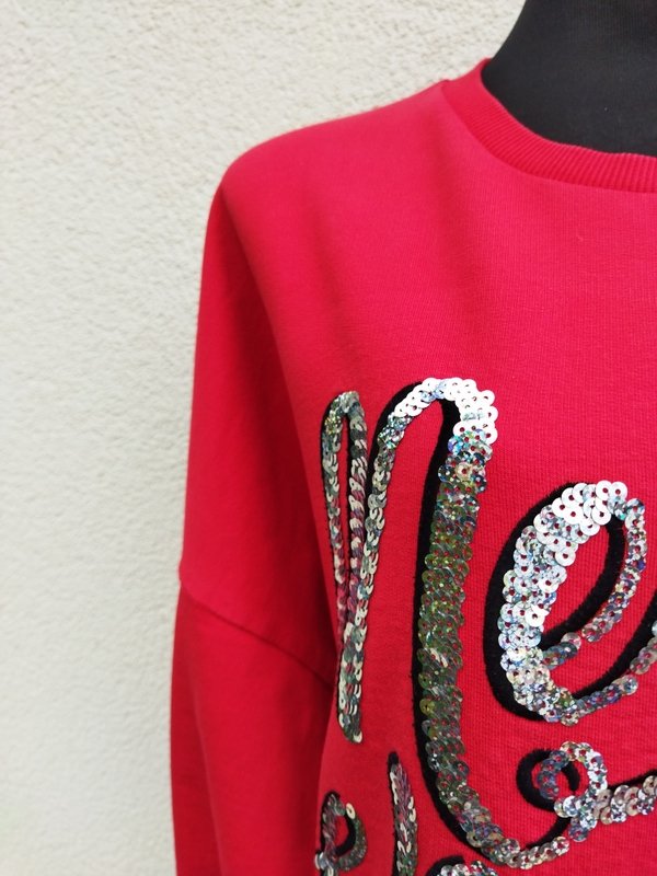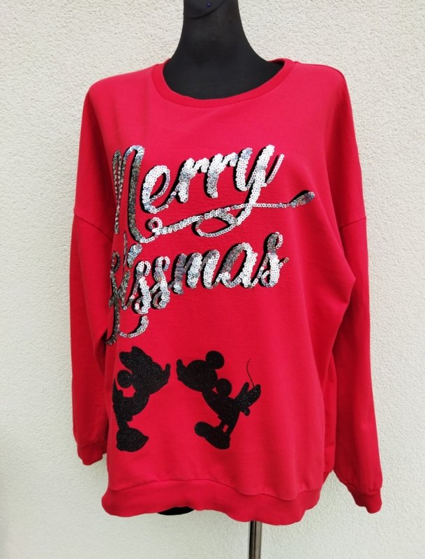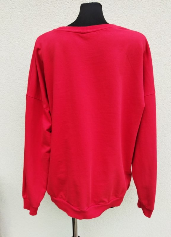 Bluza z bawełnianej tkaniny dresowej w czerwonym kolorze z zdobiona cekinowymi napisami w srebrnym kolorze na czarnym tle i czarnymi myszkami Wykończona sciagaczami