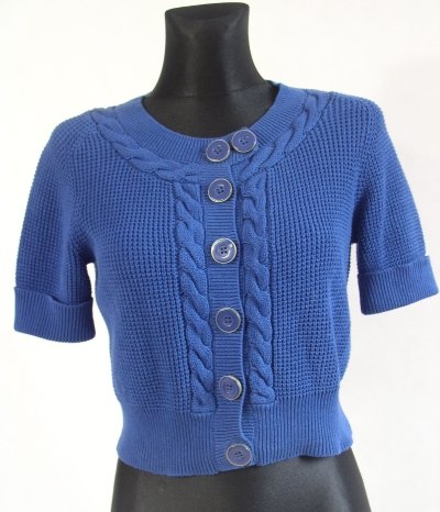 Bluzeczka sweterkowa,firmy DIVIDED dla H&M.Rozmiar 38.Materiał bawełna.Zapinana z przodu na ozdobne,duże guziki.Dekolt i rozcięcie ozdobione warkoczem.Rękaw reglan,krótki,zakończony ściągaczem wywiniętym.Stan bardzo dobry-,lekko sprany.Długość 47 cm.pod pachami 94 cm.