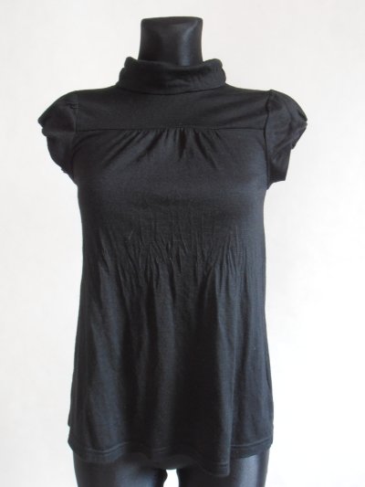 Czarna bluzka z golfem firmy DIVIDED by H&M.Rozmiar 32-34.Materiał 70% akryl + 30% wełna.Odcięta nad biustem.Dół marszczony.Małe rękawki bufki,końce podwinięte-bombki.Stan bardzo dobry.Długość 61 cm.pod pachami 84 cm.