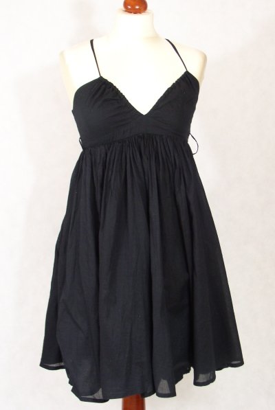 Czarna sukienka firmy DIVIDED by H&M.Rozmiar 38.Materiał bawełna.Podszewka czarna bawełniana.Odcięta pod biustem,.Staniczek z podwójnego materiału,ściągany ramiączkiem.Tył gumkowany.Ramiączka regulowane,skrzyżowane na plecach.Dół mocno marszczony.Stan bardzo dobry.Długość mierzona od pachy 67 cm.pod pachami 82 cm.bez rozciągania.Pod biustem 70 cm.