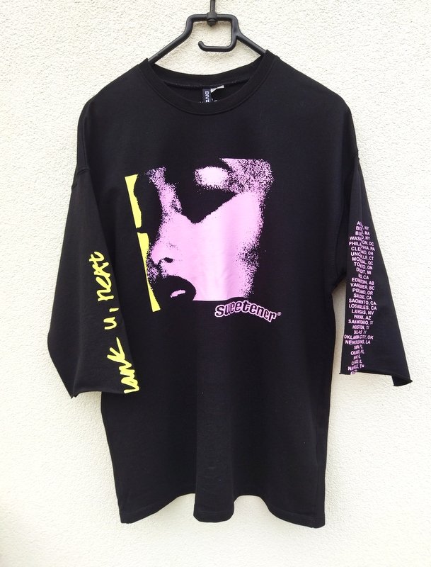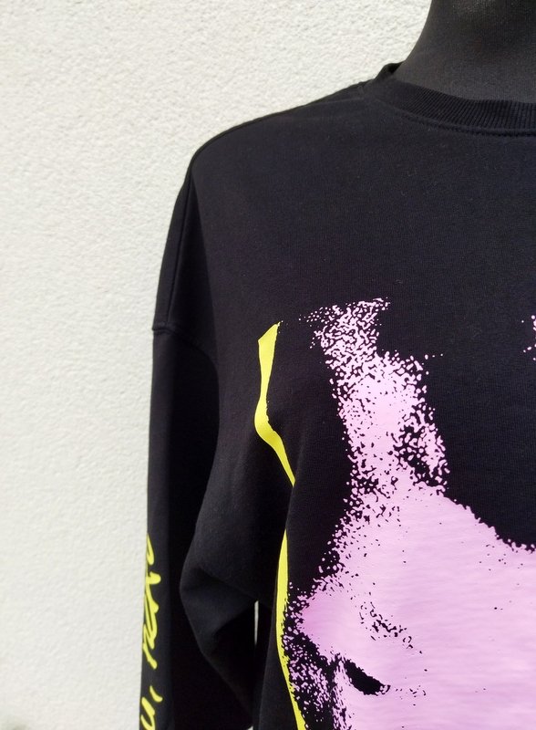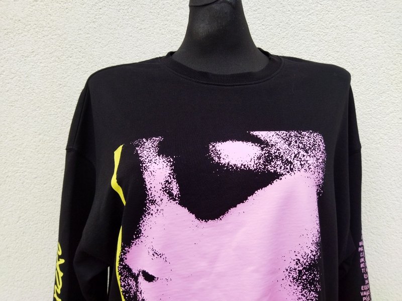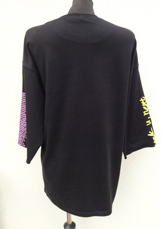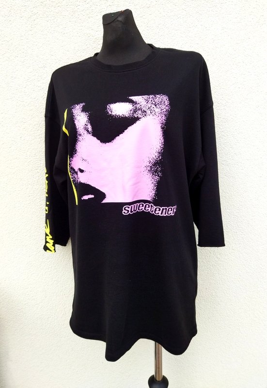 Bluza lub tunika z bawełnianej tkaniny dzianinowej w czarnym kolorze z gumowanym różowo-żółtym nadrukiem i napisami na rękawach.