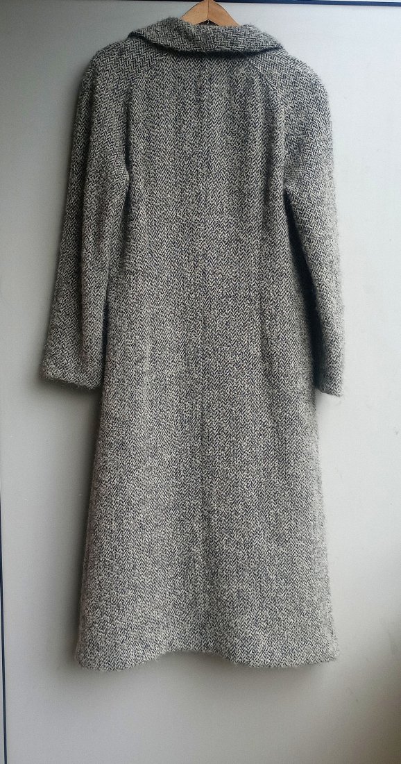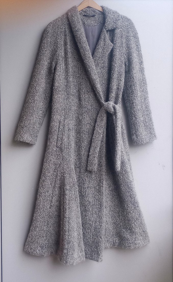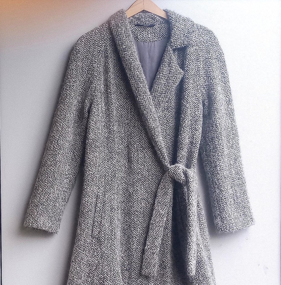 Unikatowy, dizajnerski płaszcz vintage. Ładnie profilowany w talii. Wypodszewkowany. Zapinany na jeden wewnętrzny guzik i zawiązywany na zakładkę doszytym paskiem. Rękawy reglanowe. Asymetryczny kołnierz: po prawej stronie szalowy, a po lewej stronie taki jak w typowej marynarce. U dołu płaszcza też widać element asymetryczny - prawa część ma jakby wszytą fałdę dodatkowego materiału, dzięki czemu płaszcz w tym miejscu wygląda jak sukienka. Materiał w jodełkę w jaśniejszych i ciemniejszych odcieniach szarości.
