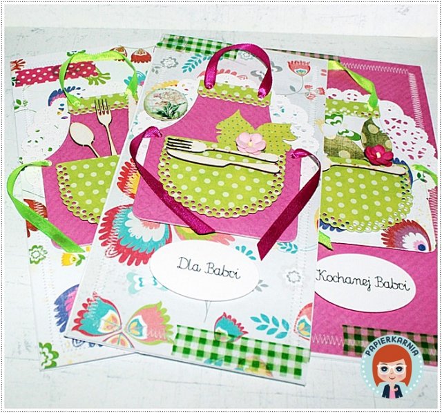 Bardzo radosna i kolorowa kartka dla babci z okazji jej święta. Główną ozdobą pracy jest fartuszek, który wszystkim wnukom kojarzy się z ciepłem i bezpieczeństwem oraz maszynowe przeszycia button, sztućce i kwiatek.