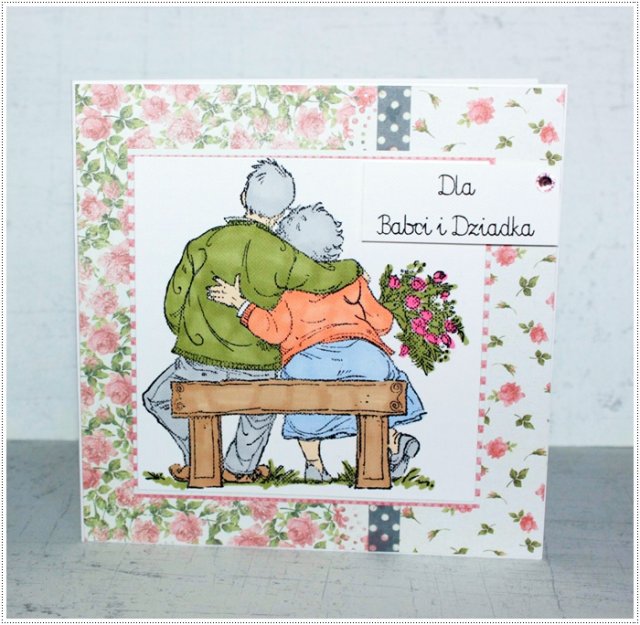 Kartka z okazji Dnia Babci i Dziadka, której główną ozdobą jest stempel przedstawiający przytulającą się parę. Doskonale nadaje się również na Rocznice Ślubu rodziców lub dziadków.