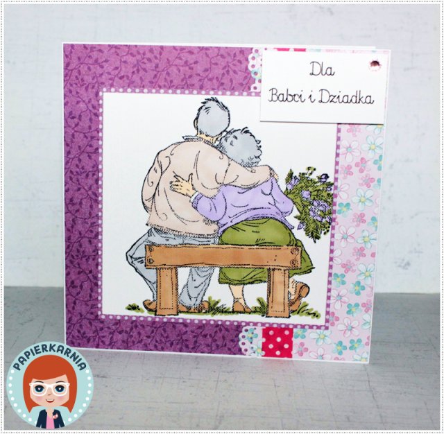 Kartka z okazji Dnia Babci i Dziadka, której główną ozdobą jest stempel przedstawiający przytulającą się parę. Doskonale nadaje się również na Rocznice Ślubu rodziców lub dziadków.
