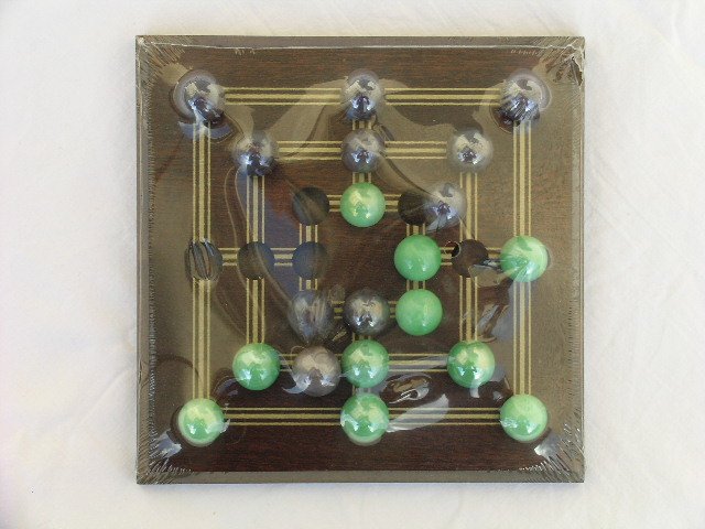 Gra dla dwojga - porządnie wykonana drewniana podstawa z filcykami od spodu i komplet szklanych kulek. Zasady opisane z tyłu. W oryginalnym opakowaniu, nie odfoliowana :) 13,5 x 13,5 cm. Stan zachowania bardzo dobry.