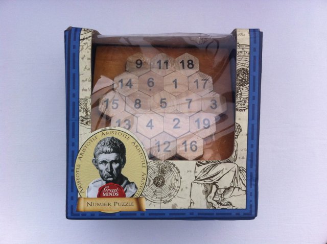 Skomplikowana łamigłówka numeryczna - celem jest takie jej ułożenie, by wszystkie rzędy tworzyły sumę 38. Drewniane klocki na drewnianej podstawce. Nowa. Poziom trudności 5/5. 15 x 16 cm. Pudełko otwierane, nieco pogięty ekran; sama łamigłówka w stanie bardzo dobrym.