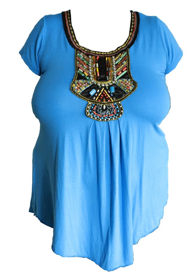 Błękitna bluzka dla Pani o puszystych kszałtach. Ozdobne wykończenie dekoltu koralikami. Boki są nieco krótsze.