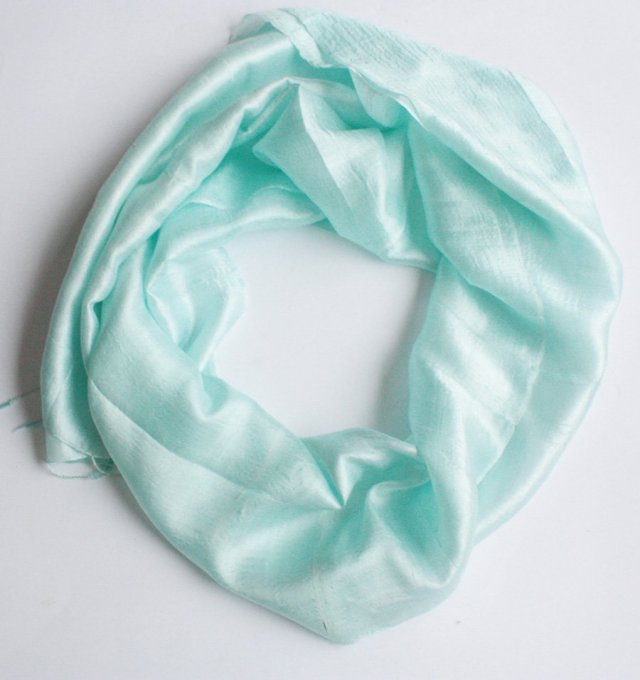 Przepiękny w swej prostocie jasnoniebieski szal wykonany z cienkiej tkaniny o niejednolitej, surowej strukturze. Moim zdaniem jest to jedwab.