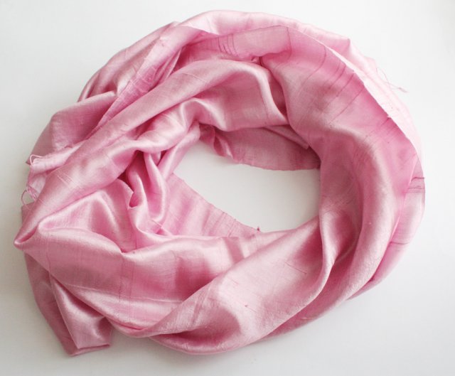 Szal o surowej, niejednolitej strukturze w subtelnym, niezwykle kobiecym odcieniu różu. Wykonany prawdopodobnie z jedwabiu.
