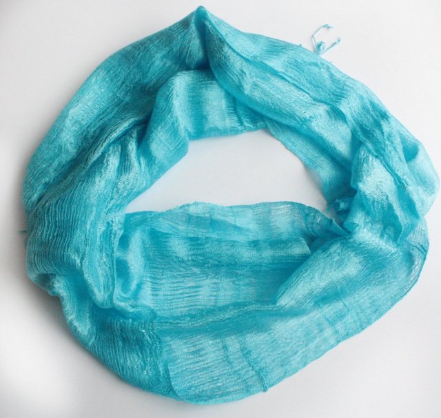 Przepiękny w swej prostocie szal wykonany z cienkiego jedwabiu o niejednolitej, surowej strukturze w odcieniu głębokiego błękitu.