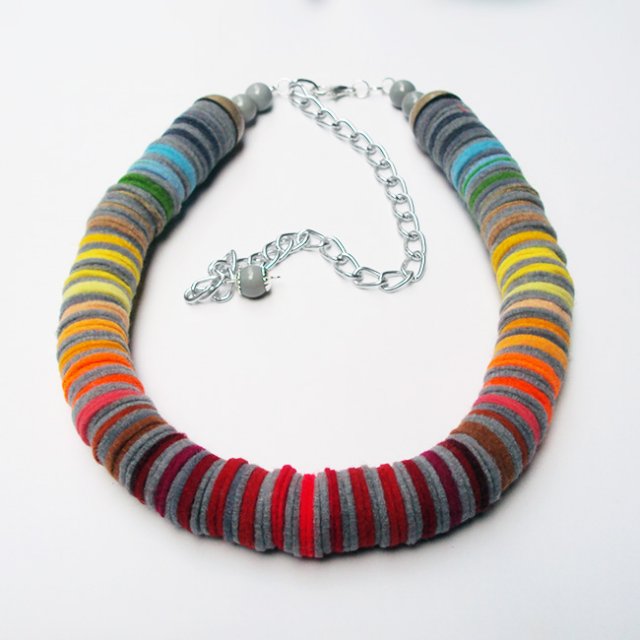 Naszyjnik w całości wykonany ręcznie z filcu . Filcowe kółeczka nawleczone na żyłkę jubilerską tworzą kompozycję barwną w kolorach tęczy , z naciskiem na odcienie czerwieni, pomarańczu i żółci , a kolorem bazowym jest szary. Średnica naszyjnika wynosi 2,5 cm, jest lekki, bardzo strojny. zapięcie ozdobne na łańcuszku aluminiowym, zakończonym koralikiem dobranym kolorystycznie.