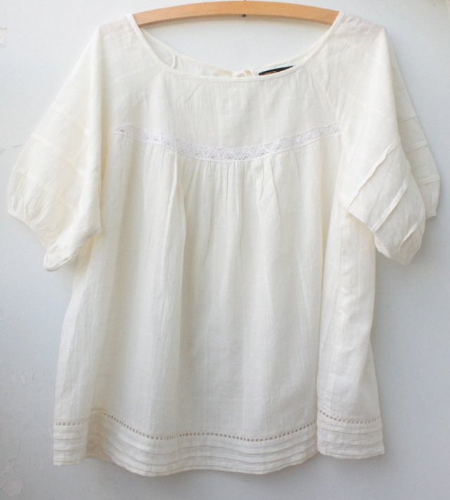 Bardzo kobieca, kremowa bluzka w odkrytymi częściowo plecami. Polecam Paniom o puszystych kształtach lub do noszenia w wersji oversize. Osoba na zdjęciu nosi rozmiar 46.