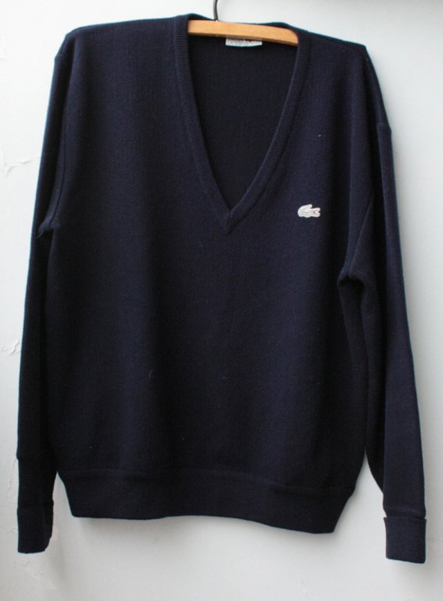 Granatowy sweter LACOSTE. Wyprodukowano w Hiszpanii. Idealny dla osoby o puszystych kształtach.