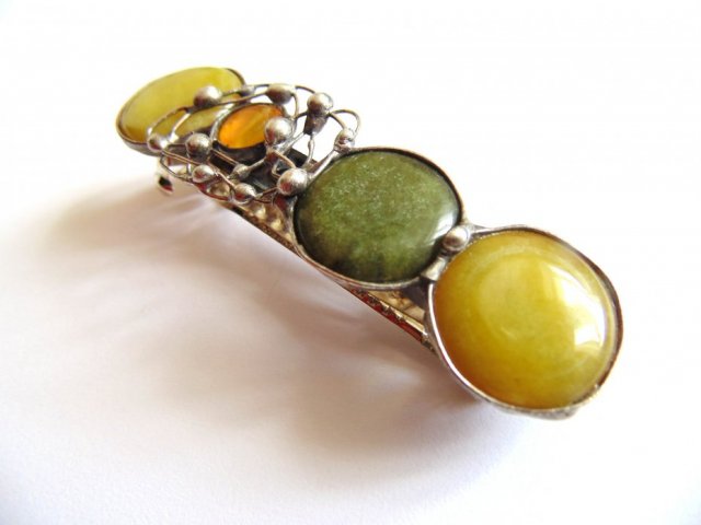 Klamra do włosów, wykonana z miedzi, cyny i jadeitów. Zapięcie metalowe, automatyczne. Wymiary ok. 8 na 2 cm.