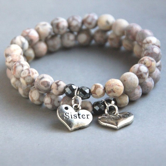 ZDĄŻYMY? ZDĄŻYMY! :D choćbym miała na rzęsach stanąć, wszystkie zamówienia opłacone do rana do poniedziałku wysyłam POLECONYM PRIORYTETEM (szybciej niż kurierem - serio!) we wt. rano i śr./ czw. są na miejscu!!!! siostrę swą kochać trzeba. trzeba i już - takie są zasady ;-) ... z miłości do mojej siostrzyczki - kolejna odsłona siostrzanej kolekcji! bransoletki są dość uniwersalne i występują w najpopularniejszych kolorach, więc na pewno znajdziesz u mnie trafiony prezent ;-) TUTAJ: NOWOŚĆ!!! delikatna, lecz okazała bransoletka wykonana z kul MATOWEGO JASPISU oceanicznego (8mm) w odcieniach beżu. dodatkowo: po 2 kule fasetowanego hematytu i jaspisu 6mm...... (UWAGA! zdj. poglądowe. wybarwienie kamieni delikatnie różni się w każdej bransoletce) . zawieszka dwustronna SISTER kolorze srebrnym.... kamienie na solidnej lince elastycznej.... JASPIS – działa kojąco i uspokajająco w okresie wzmożonego stresu; daje siłę i energię.... OBW. WEWNĘTRZNY: 16,5CM... możesz ją nosić samodzielnie lub dowolnie łączyć z innymi bransoletkami z mojego sklepiku. ZOBACZ CAŁĄ KOLEKCJĘ!!! ... MOJA BIŻU ZAWSZE PODRÓŻUJE OZDOBNIE ZAPAKOWANA - opakowanie hand made ;-) ... !!!UWAGA!!! .... cena dotyczy 1 bransoletki - jeśli chcesz zrobić prezent również sobie - kup jeszcze jedną - zostaną zapakowane dla każdej z sióstr osobno ;-)