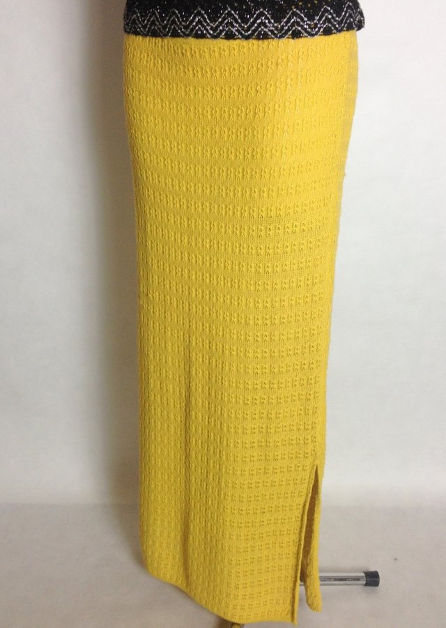 Długa dzianinowa spódnica, delikatnie ażurowa w kolorze stonowanej żółci , w pasie na gumce, fason minimalnie rozkloszowany, u dołu rozcięcie. Spódnica wykonana z dzianiny delikatnie sweterkowej- brak informacji ze składem.