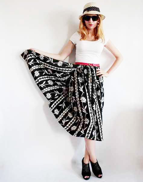Portfelowa czarno-biała spódnica. W talii wszyta gumka. Materiał to prawdopodobnie wiskoza.